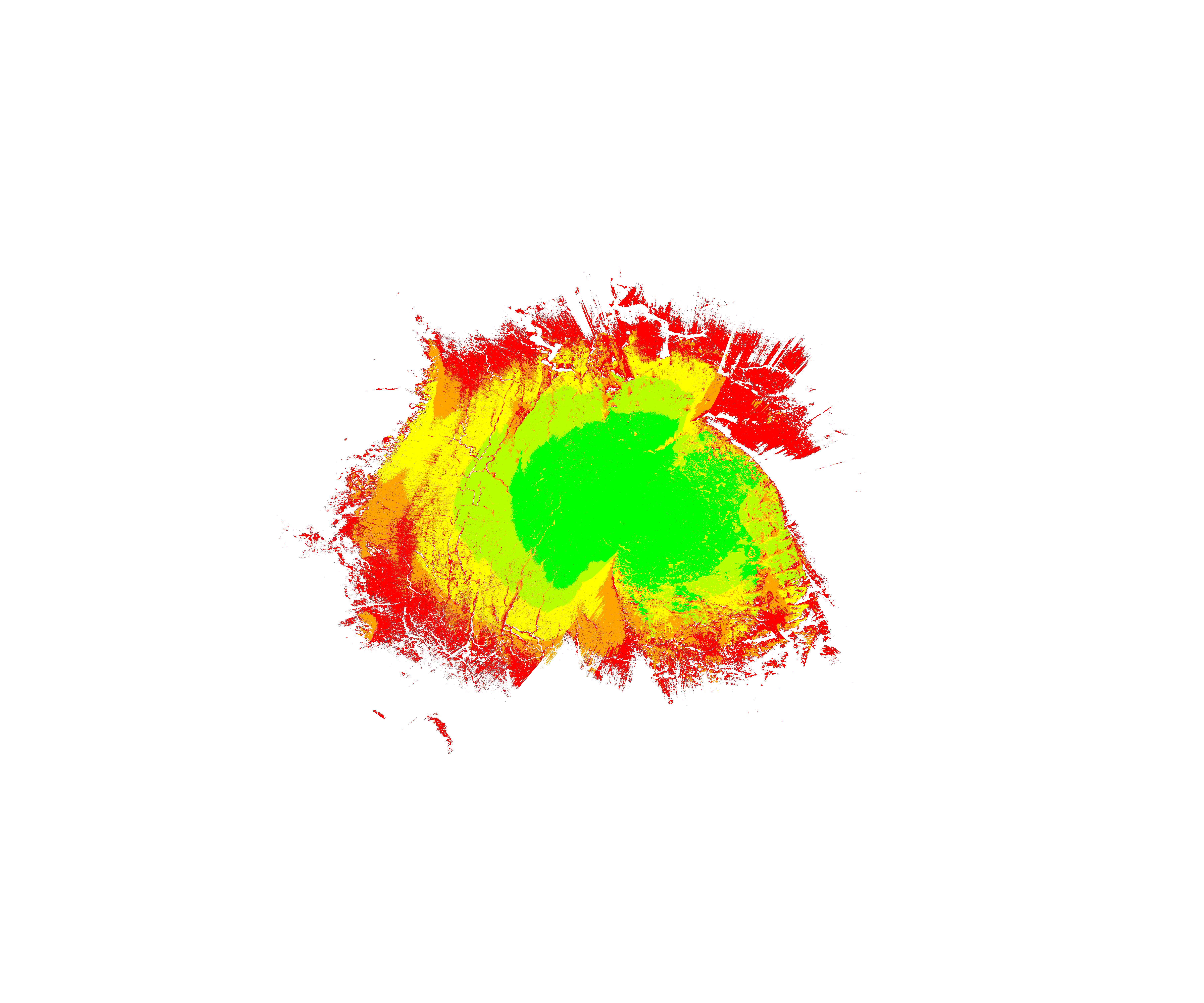 Colorful coverage map which accounts for terrain in a detailed way.