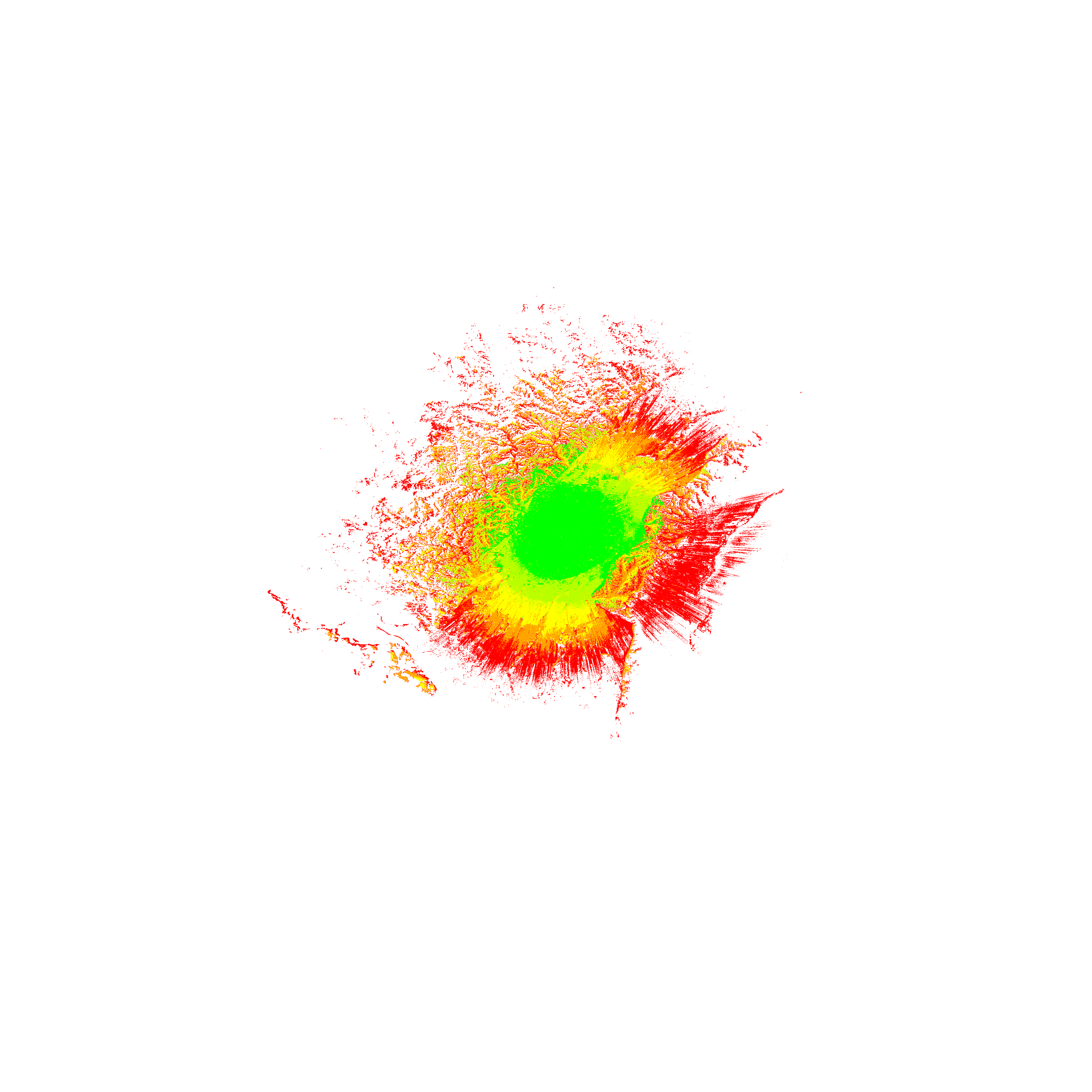 Colorful coverage map which accounts for terrain in a detailed way.