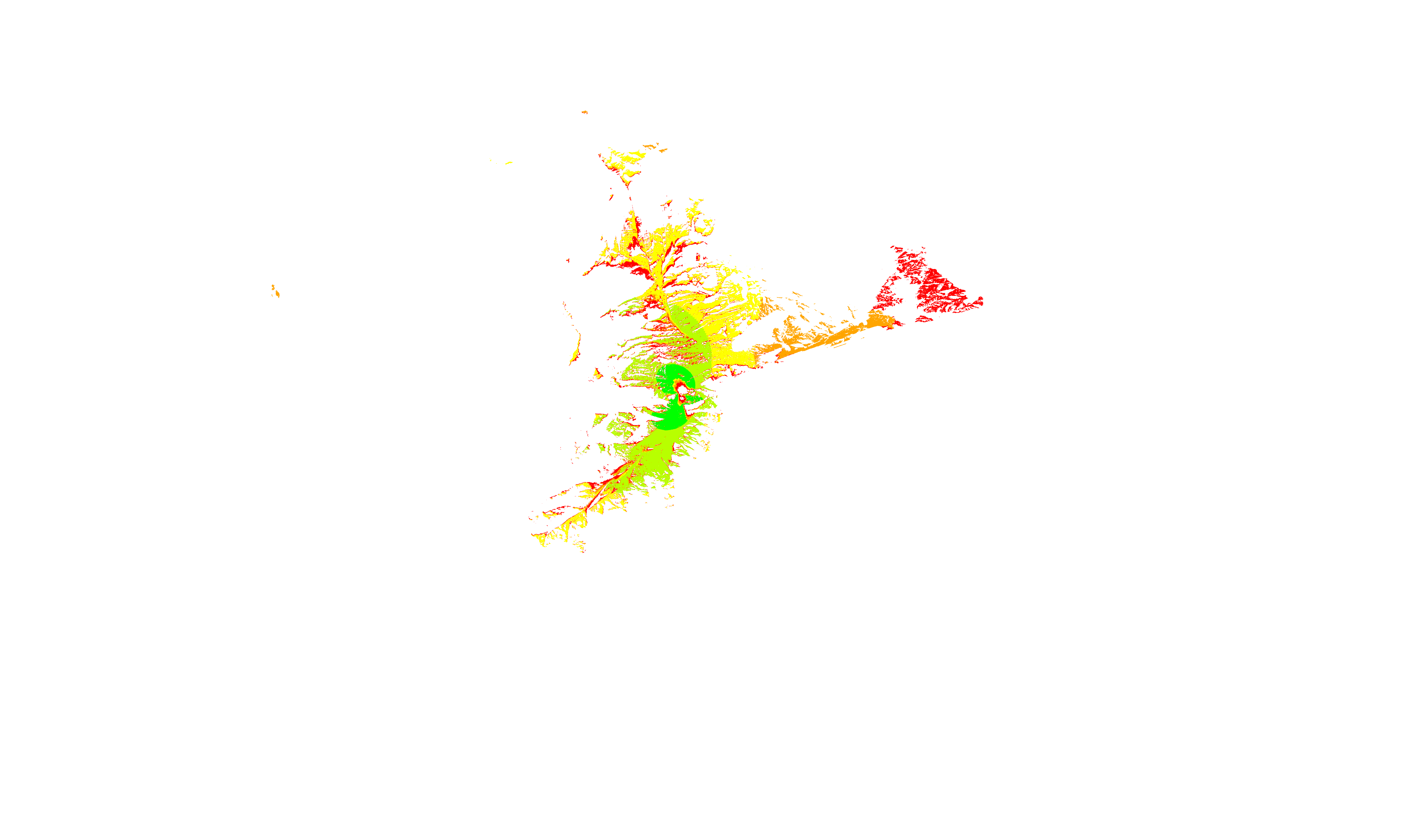Colorful coverage map which accounts for terrain in a detailed way.