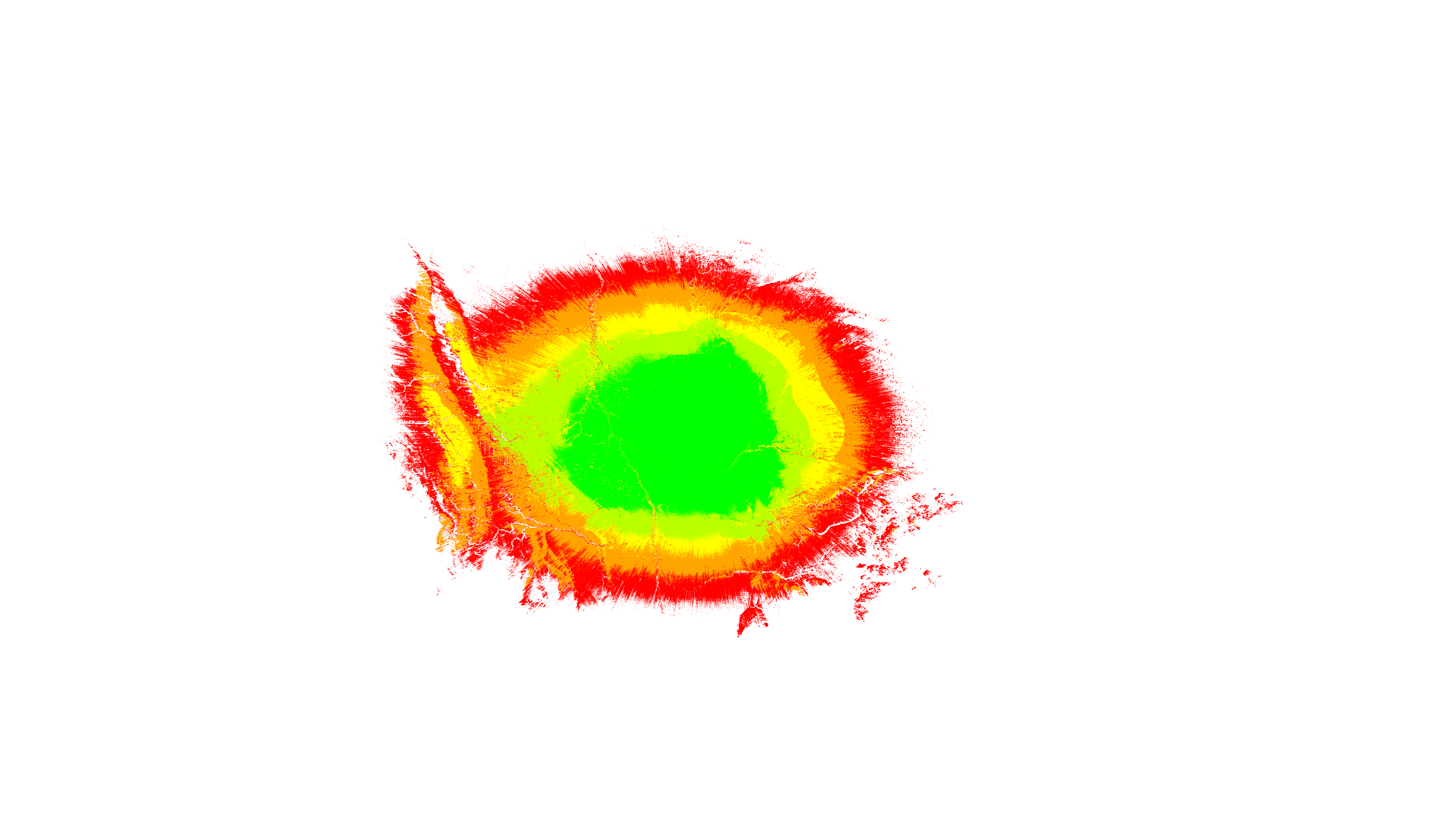 Colorful coverage map which accounts for terrain in a detailed way.