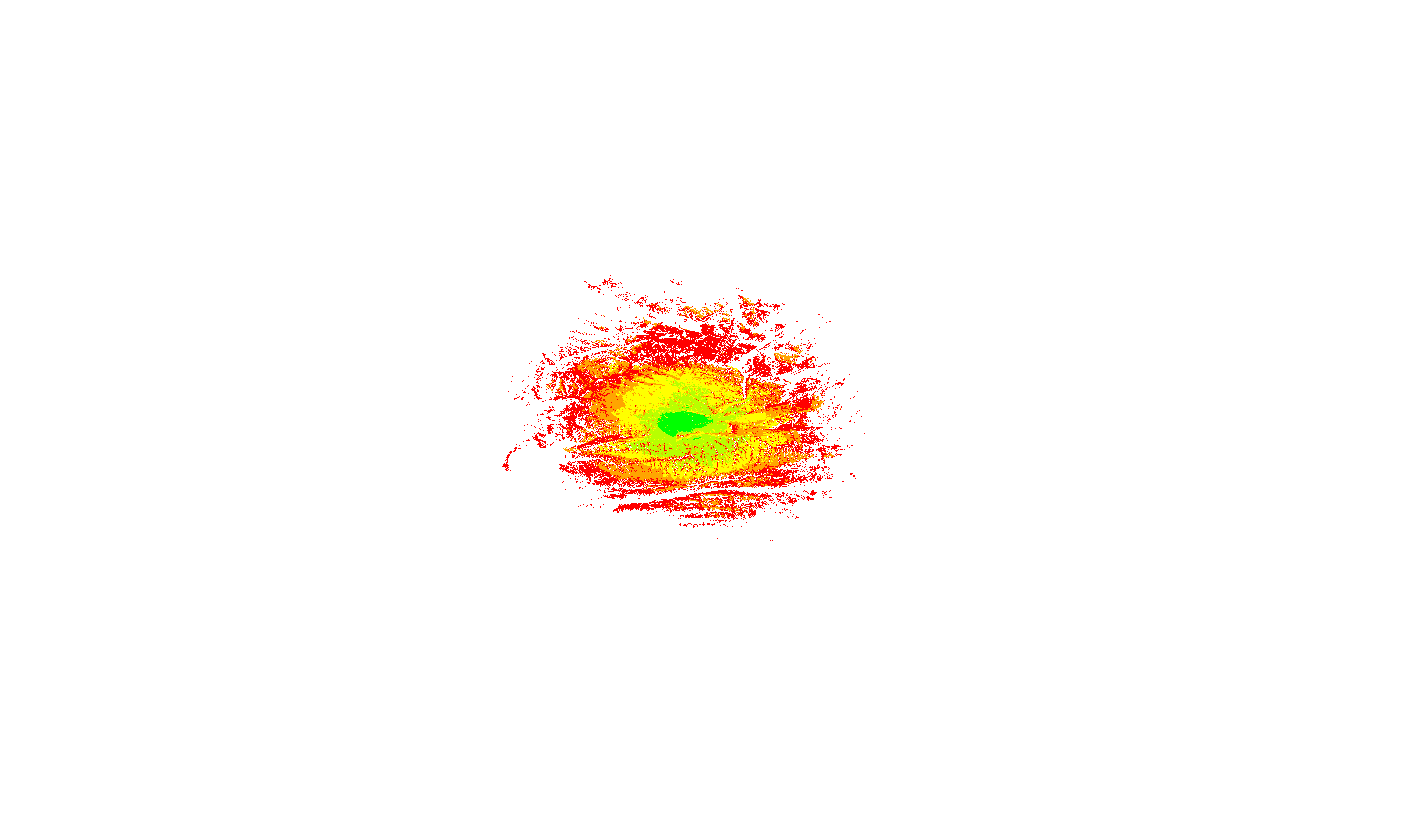 Colorful coverage map which accounts for terrain in a detailed way.