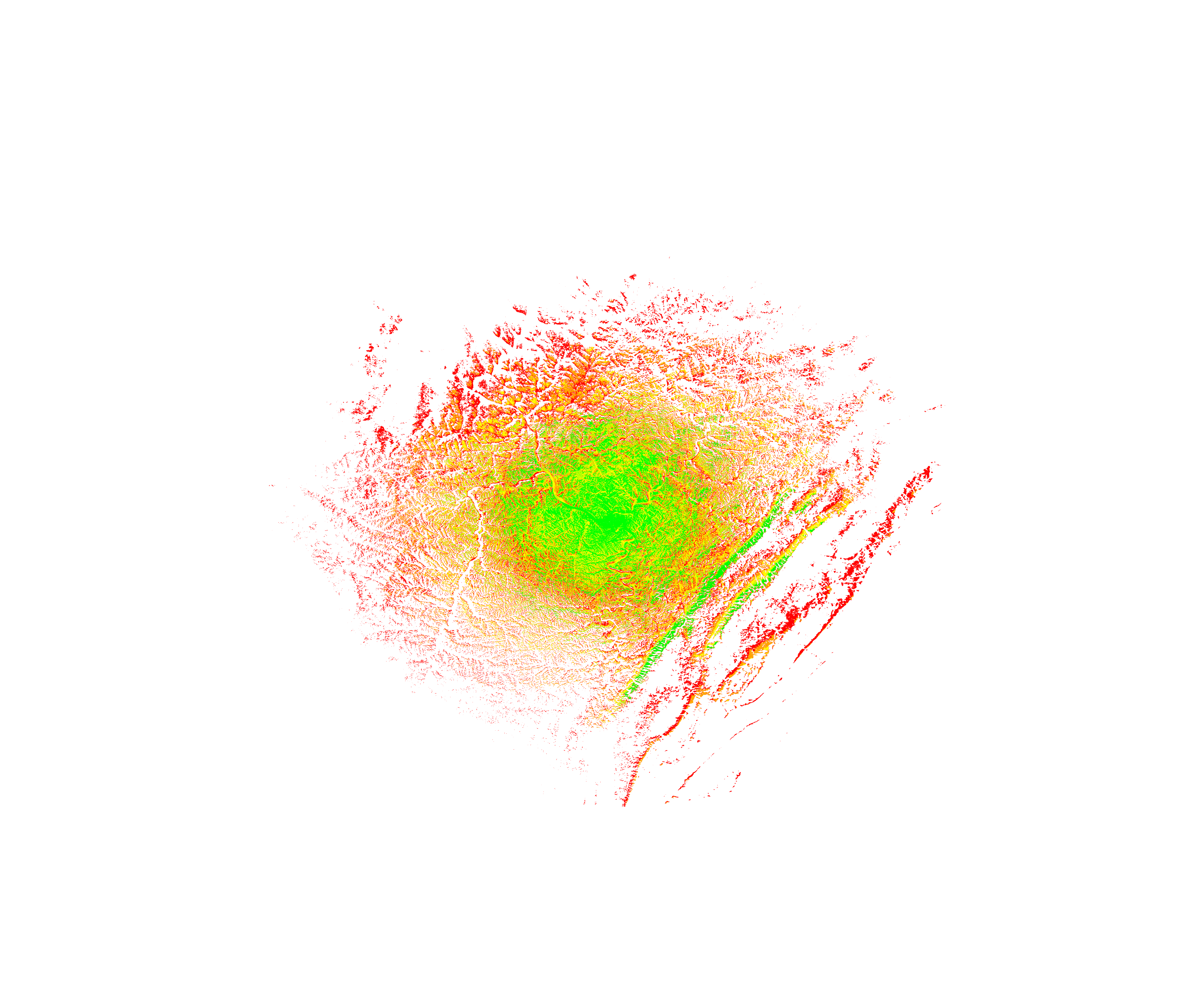 Colorful coverage map which accounts for terrain in a detailed way.