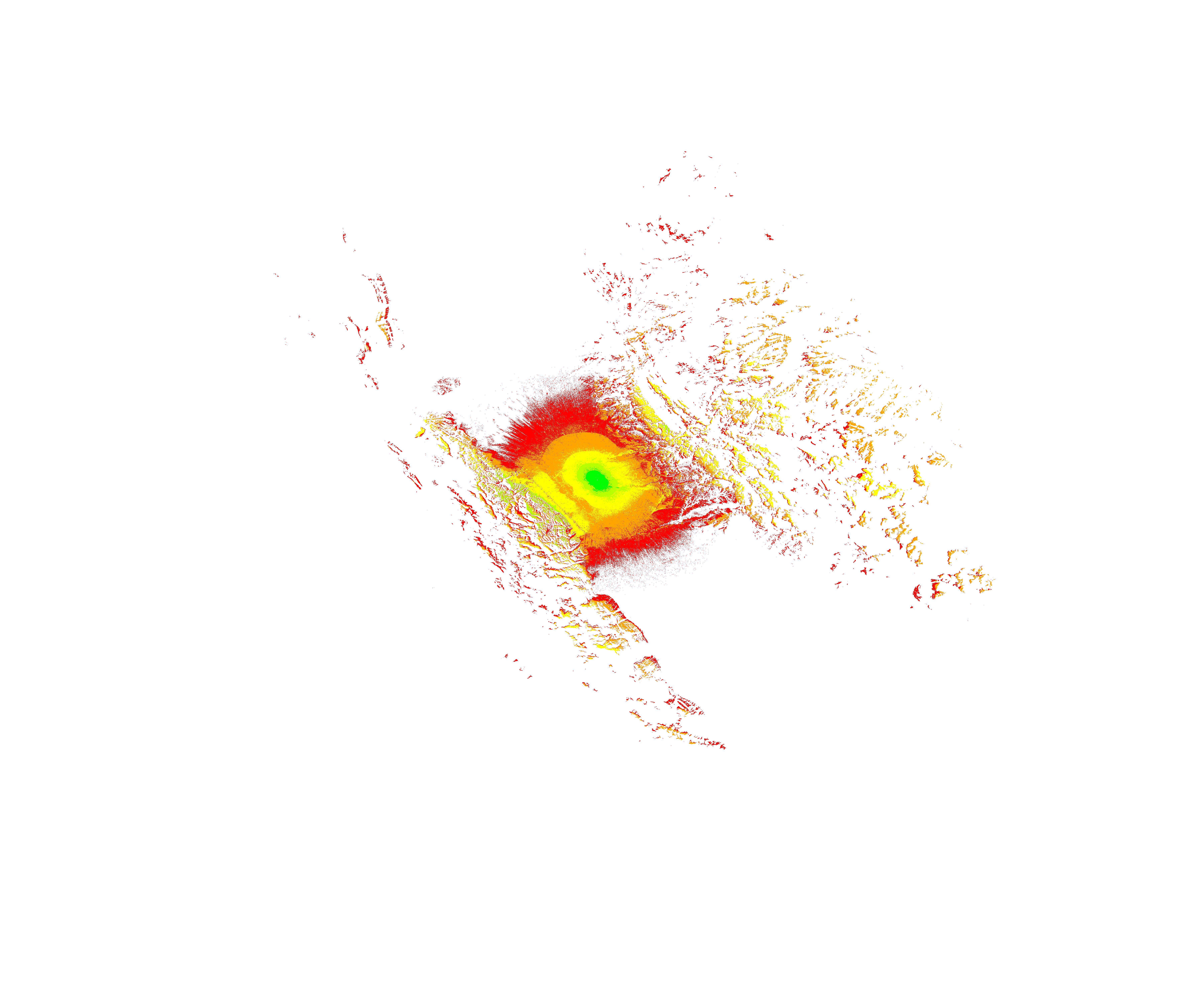 Colorful coverage map which accounts for terrain in a detailed way.