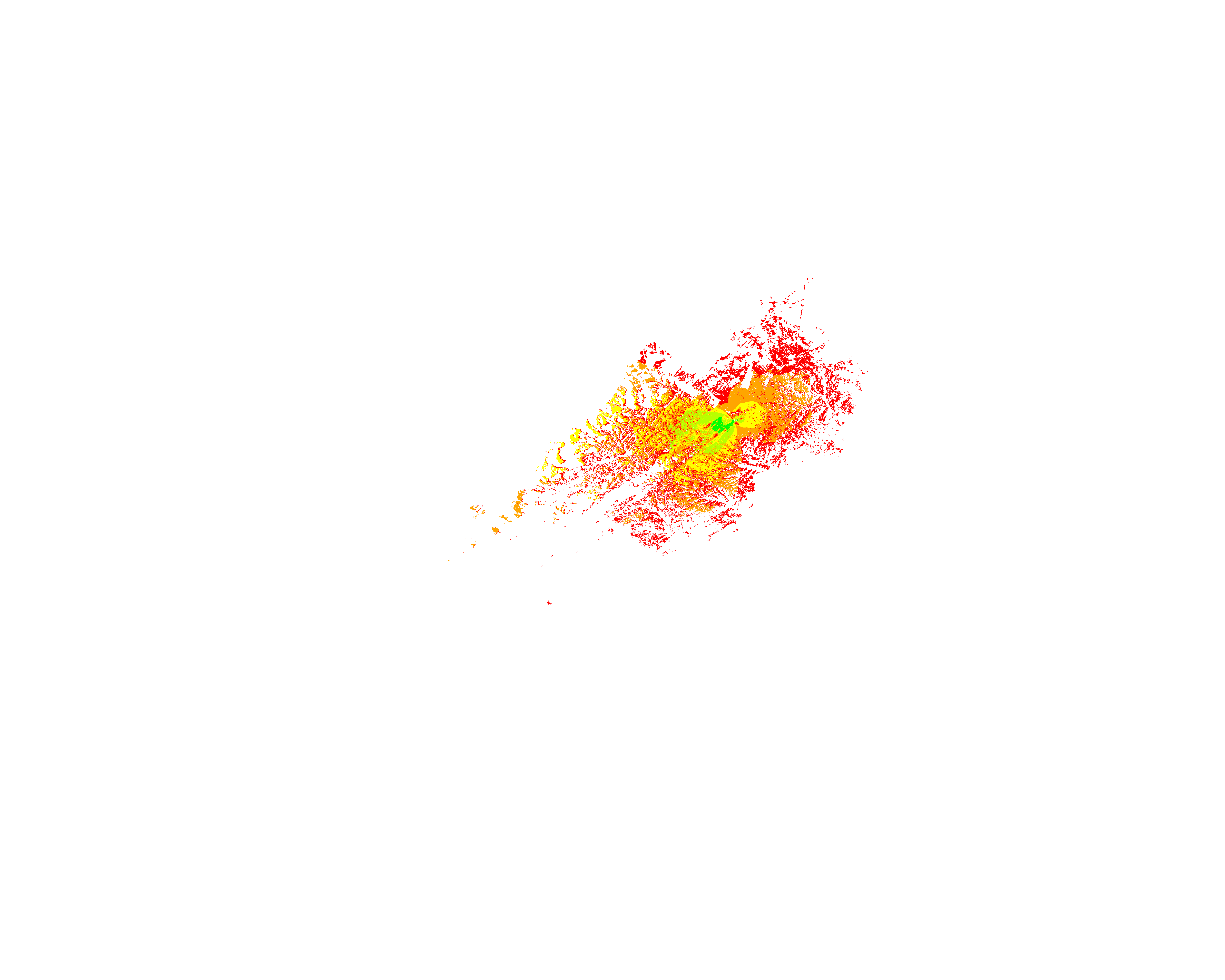 Colorful coverage map which accounts for terrain in a detailed way.