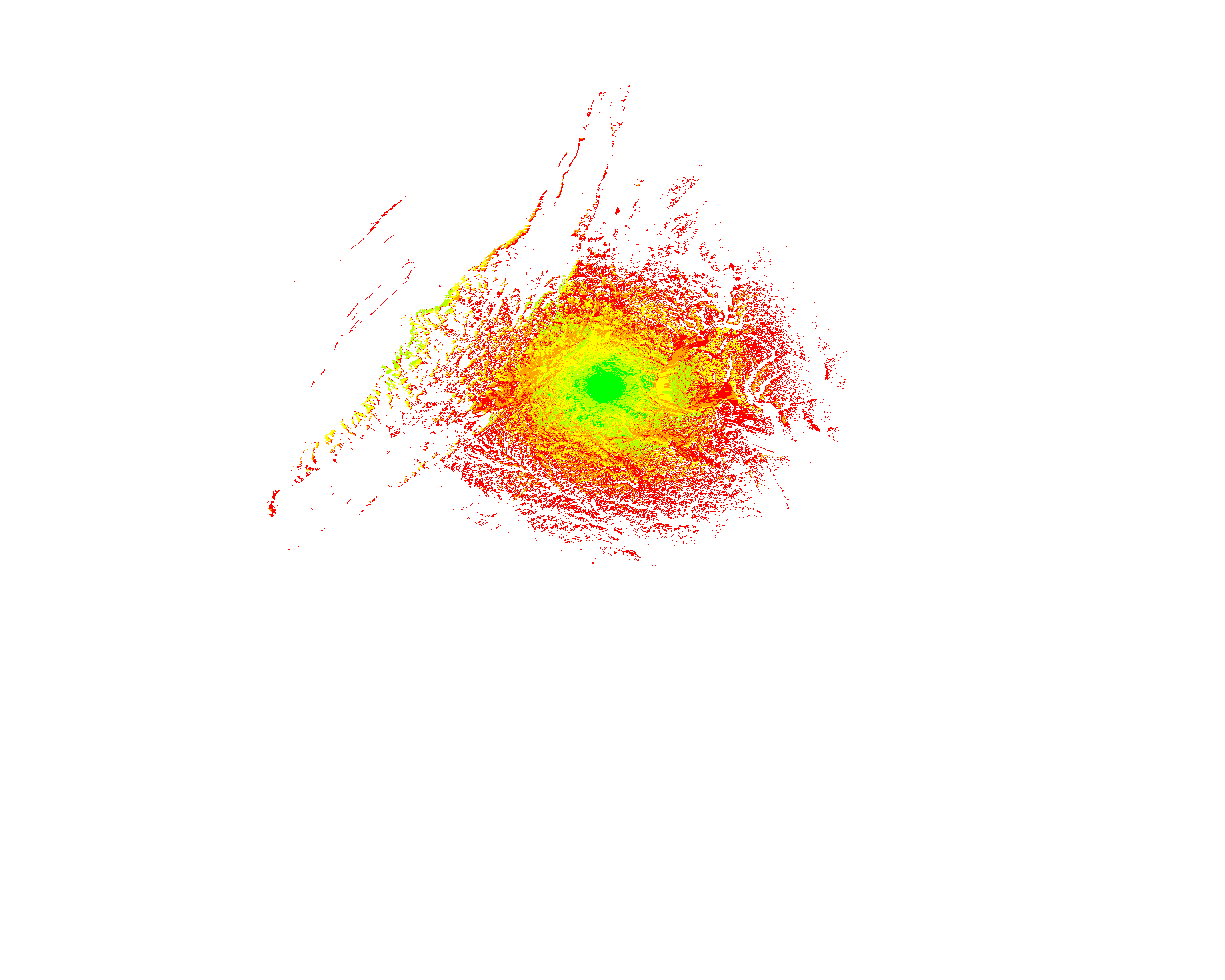 Colorful coverage map which accounts for terrain in a detailed way.