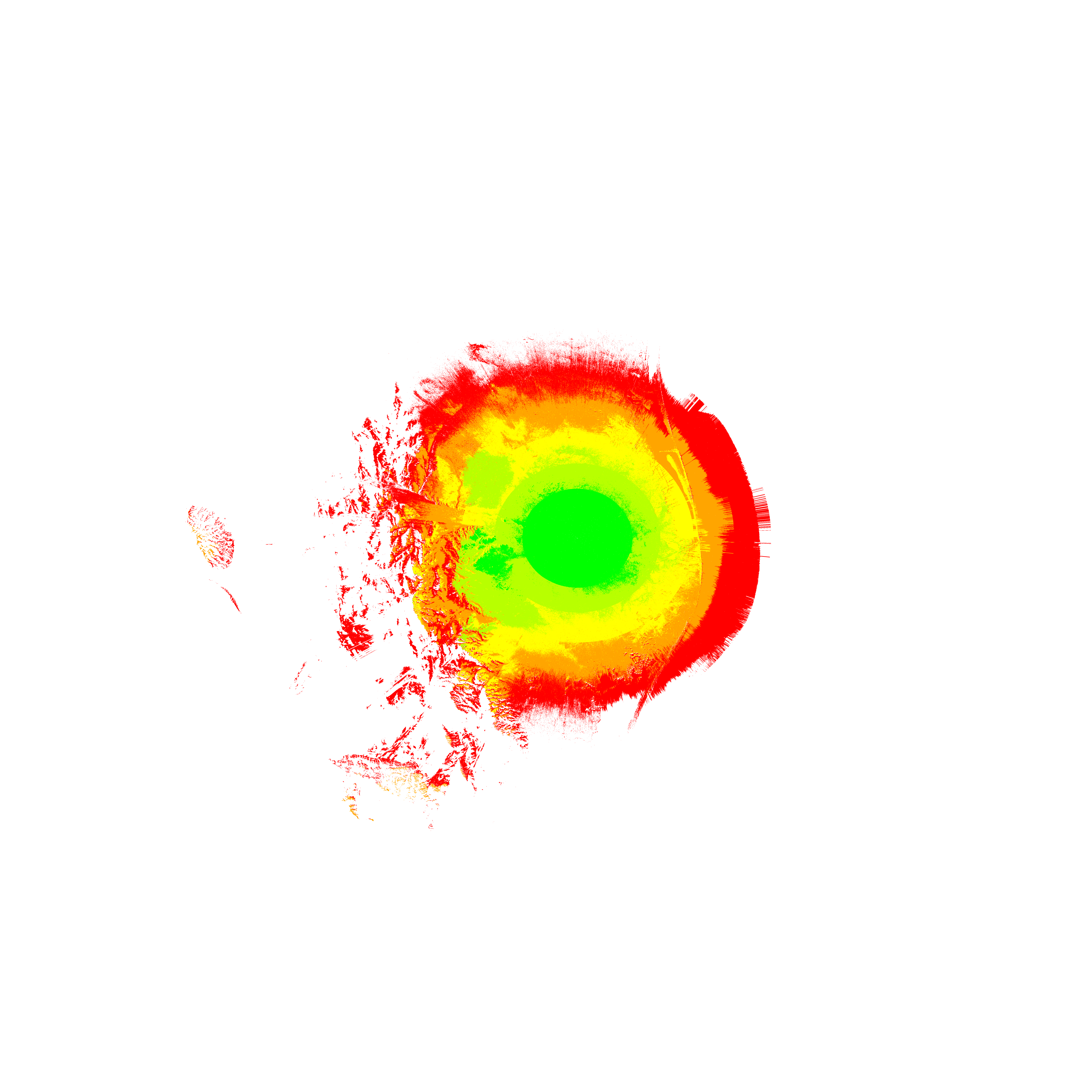 Colorful coverage map which accounts for terrain in a detailed way.