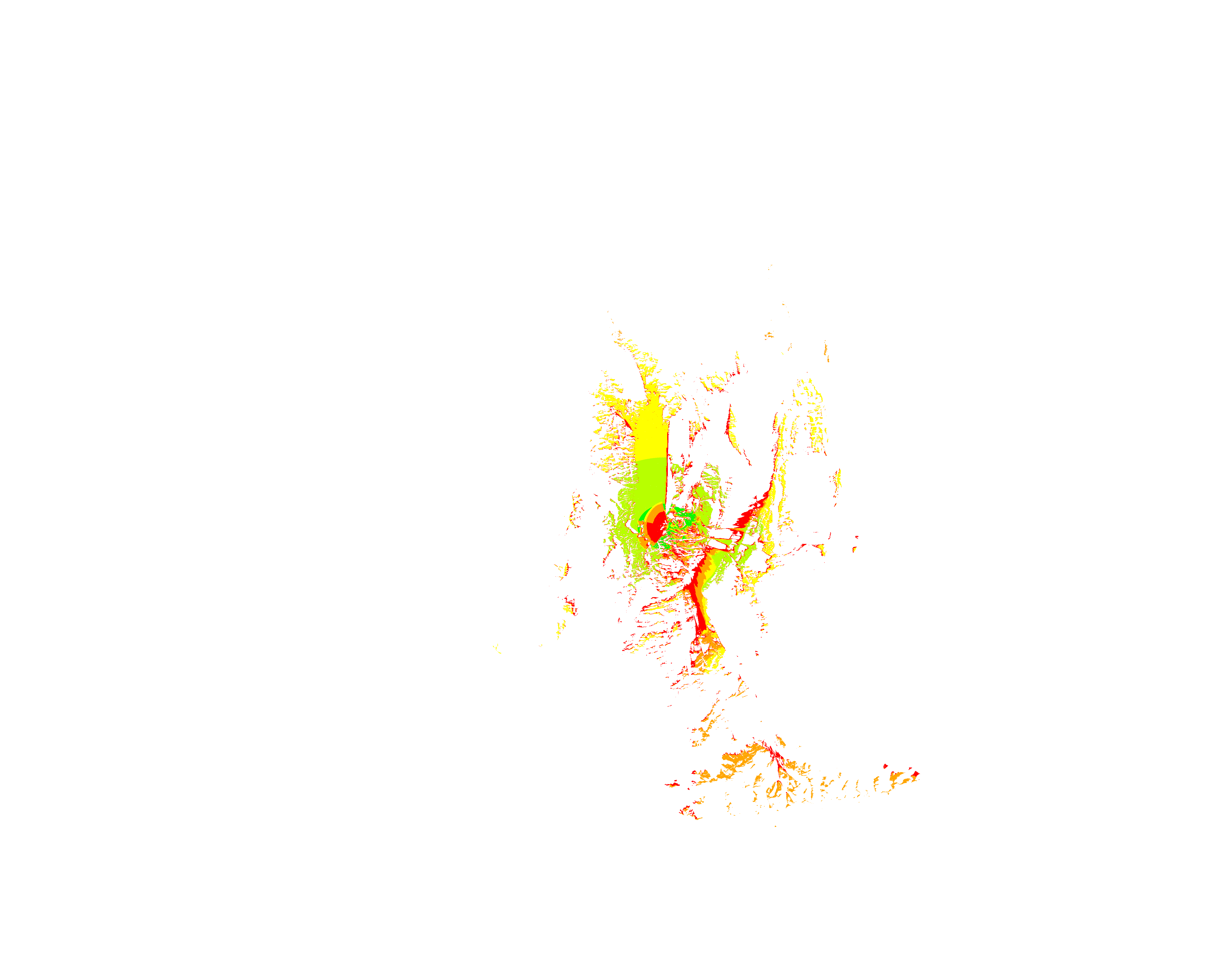 Colorful coverage map which accounts for terrain in a detailed way.